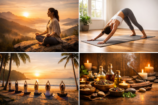 Escape to blissful yoga retreats-immerse in ancient practices of Hatha yoga ,Astanga yoga Meditation, healing sessions, and serene landscapes. Rediscover balance, rejuvenate your spirit, and embark on a transformative journey of self-discovery.a specialized getaway that combines elements of relaxation, self-discovery, and physical well-being through the practice of yoga, meditation, and other wellness activities, offering a structured break from daily life to focus on personal growth and rejuvenation. Yoga retreats aim to provide a space for unwinding, growing, and relaxing on a deeper level, often involving a temporary break from daily routine.🌟🧘